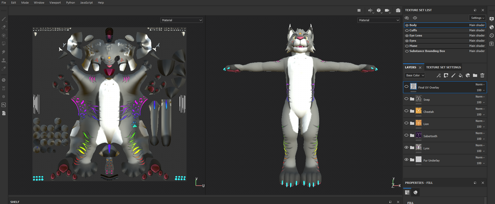 A Unity package containing 10 avatar configurations (Male/Female Lynx, Sabertooth, Cheetah, Snow Leopard, and Lion), as well as Substance Painter and Blender files
