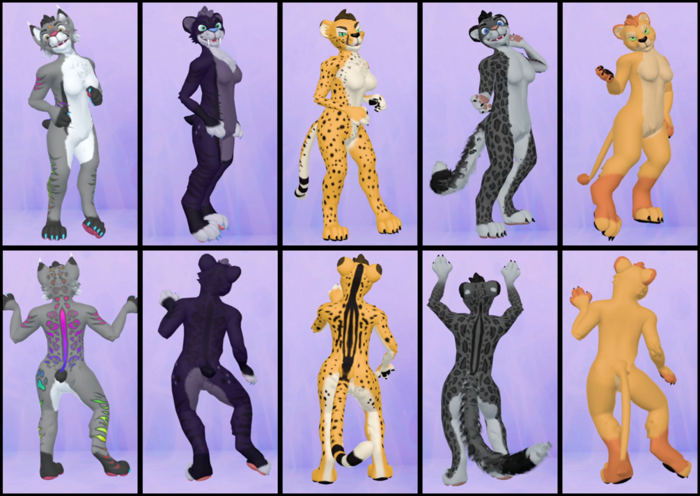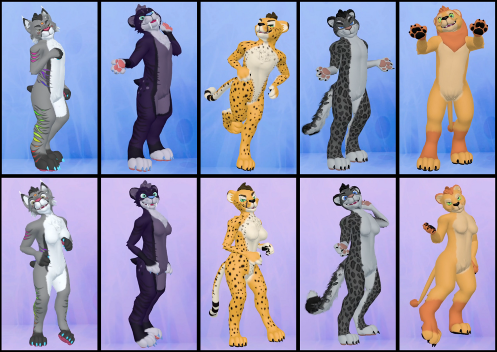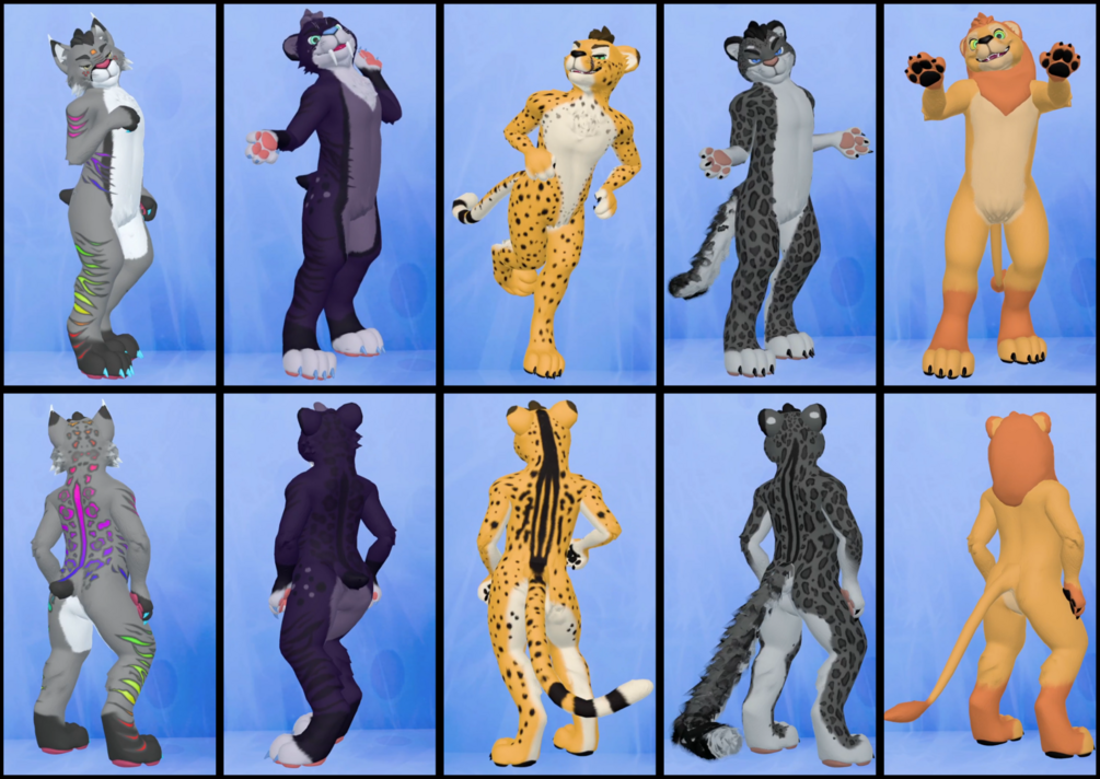 This purchase includes a VRChat compatible Unity Package containing containing 10 avatar configurations (Male/Female Lynx, Sabertooth, Cheetah, Snow Leopard, and Lion) as well as Substance Painter and Blender source files for creating the texture sets and the base .fbx model.